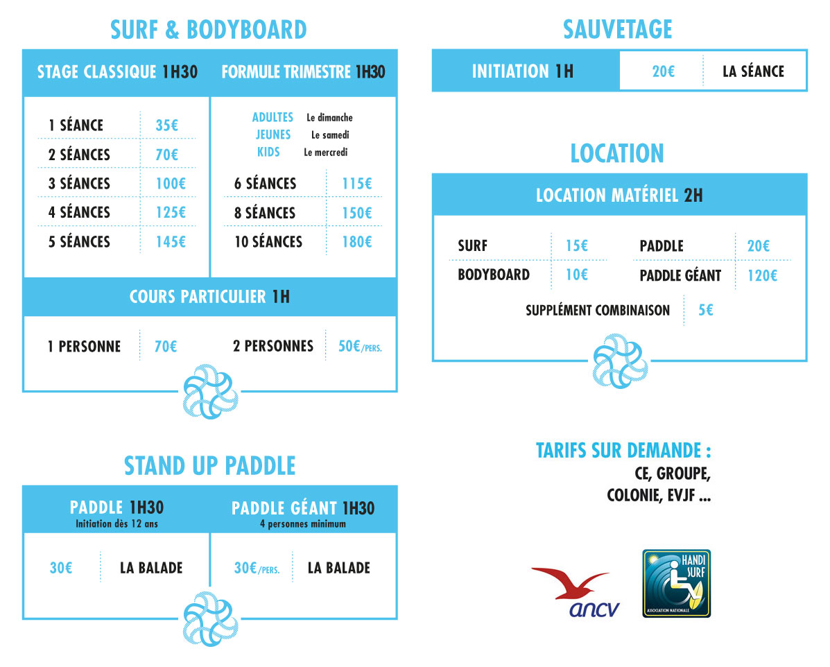Matériel fourni : combinaison intégrale, planche, pagaie, lycra de couleur